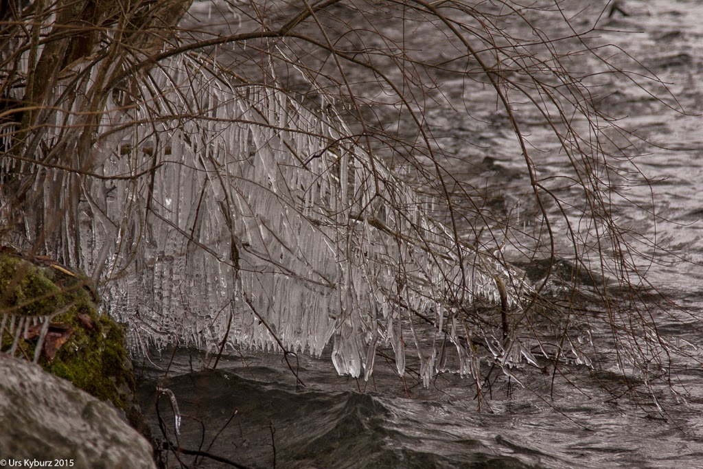 Nachdem wir uns im Restaurant Schifflände, das dem treuen Leser inzwischen bekannt sein dürfte, aufgewärmt haben, setzen wir unseren Weg dem See entlang fort. Wir sind nun in eisigen Gefilden unterwegs, der Schnee ist hier verschwunden. Dafür zauberte die Bise am Ufer schöne Eisgebilde hervor. Eisbirnen in allen Grössen und Formen haben sich an Ästen gebildet, die ins Wasser hängen. Wasserbirnen entstehen von 0 Grad an abwärts durch ständiges benetzen, wie es durch Wellen geschieht, die jetzt durch die kräftige Bise relativ hoch gehen.