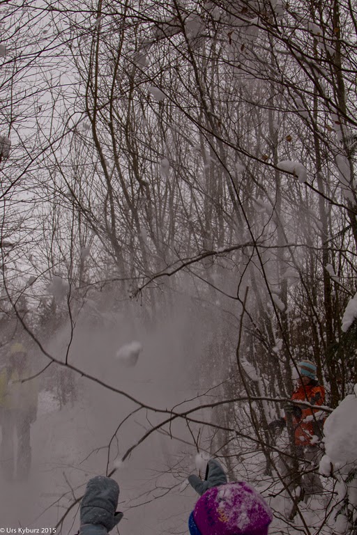 So schön, wenn praktisch vor der Haustüre so viel Schnee liegt! Bald kommen wir zum Restaurant Homberg, doch zuvor gibt es nochmals eine ordentliche Schneeschlacht.