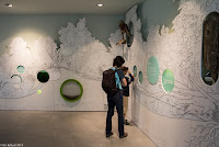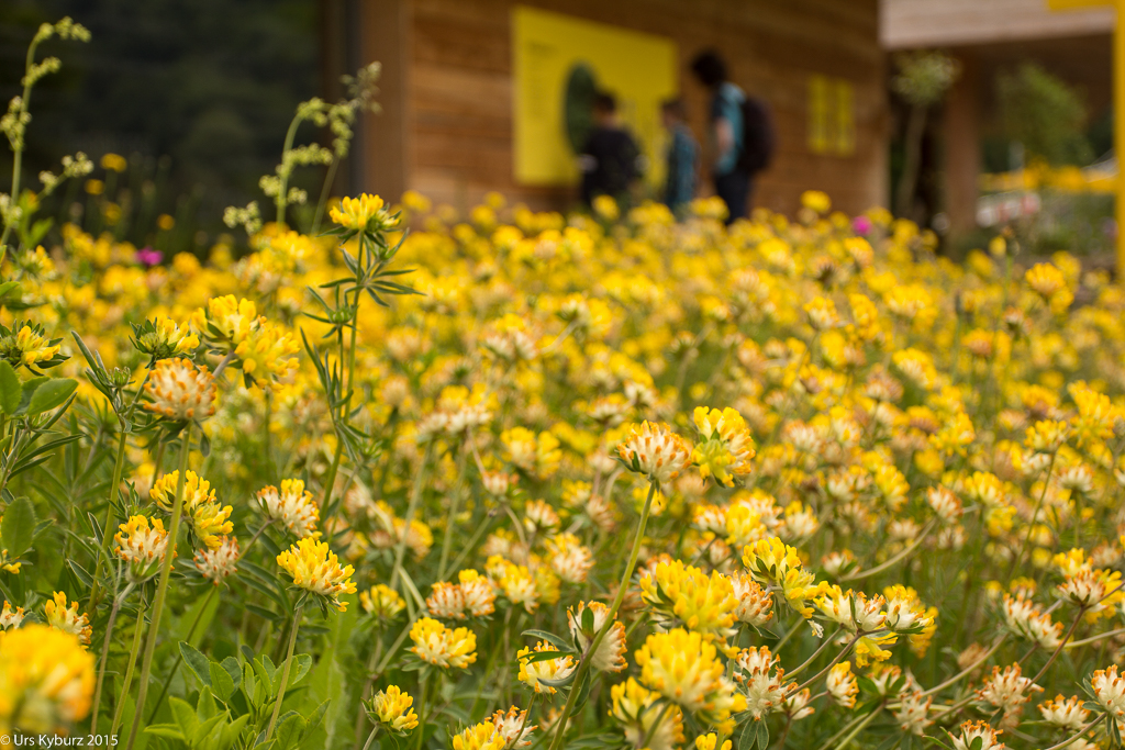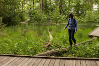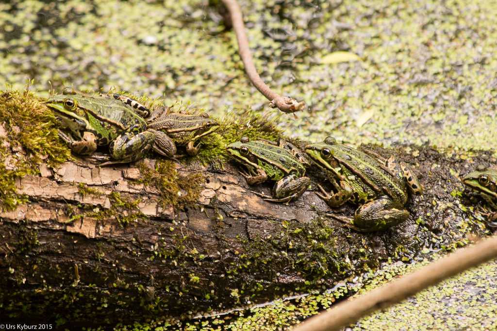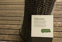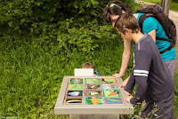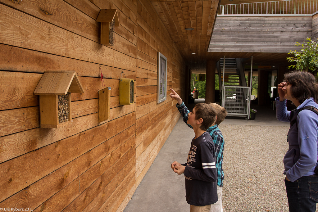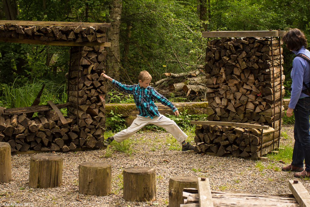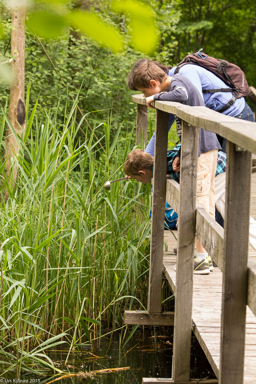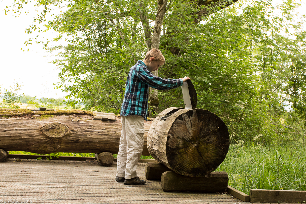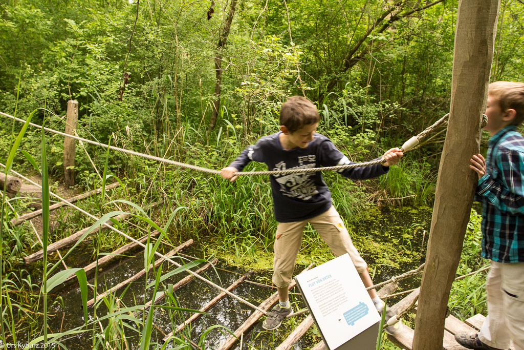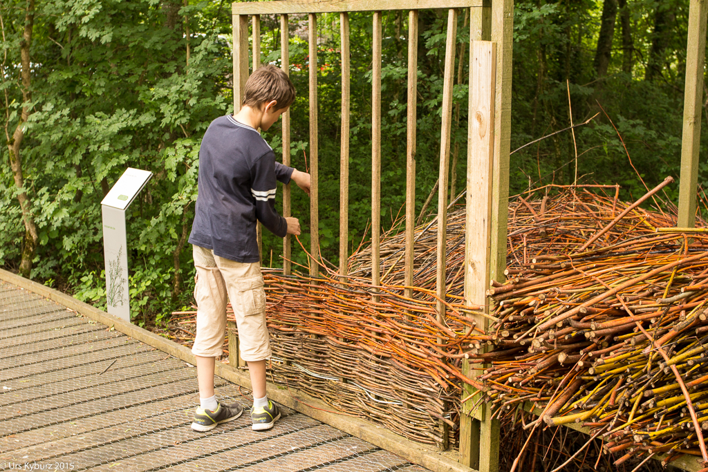 Nun haben wir genug gelernt, wir wollen nach draussen. Über eine Treppe steigen wir auf das Gebäude und haben einen schönen Überlick über das Gelände. Ein Brücke führt über den Platz darunter. Auf der anderen Seite hat man einen Anblick, den man normalerweise nicht hat: Man sieht direkt in die Baumkronen. Nach dem Abstieg befinden wir uns mitten in einem Stück Auenwald, mit Sümpfen, Bächen und Teichen. Ich komme mir vor wie im tropischen Regenwald. Überall sind Frösche, wahrscheinlich Teichfrösche. Regungslos sitzen sie auf Ästen, die im Wasser liegen. Eine Seilbrücke führt über einen Teich, jedoch würde man jetzt ziemlich nasse Füsse kriegen. Und überall sieht man Spuren vom Biber: Seine Pfade, die er immer geht, geschälte Äste, angenagte Bäume. Damit er nicht jeden annagt, sind sie zum Teil mit Drahtgeflecht eingewickelt. Bequeme Liegen laden zum Verweilen, Lauschen und Sehen ein. Es ist eine richtige kleine Oase der Ruhe im Trubel des Zeltplatzes. Holzbeigen dienen, je nach Lust und Laune, zum Absitzen oder zum Rumturnen. Die Kinder haben sich natürlich für zweiteres entschieden. Im Schilf macht ein Teichrohrsänger auf sich aufmerksam. Bei der nächsten Station lernt man die Bedeutung von Silberweiden kennen und mit bereitgestellten Weidenästen kann man sich im Flechten versuchen. Da der Rundgang so schön ist, machen wir ihn gleich nochmals.