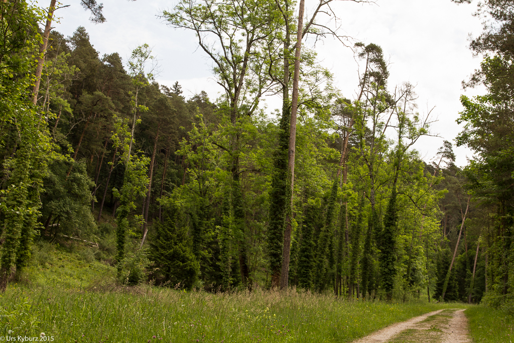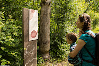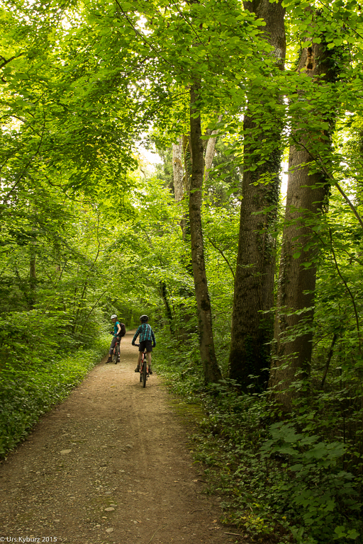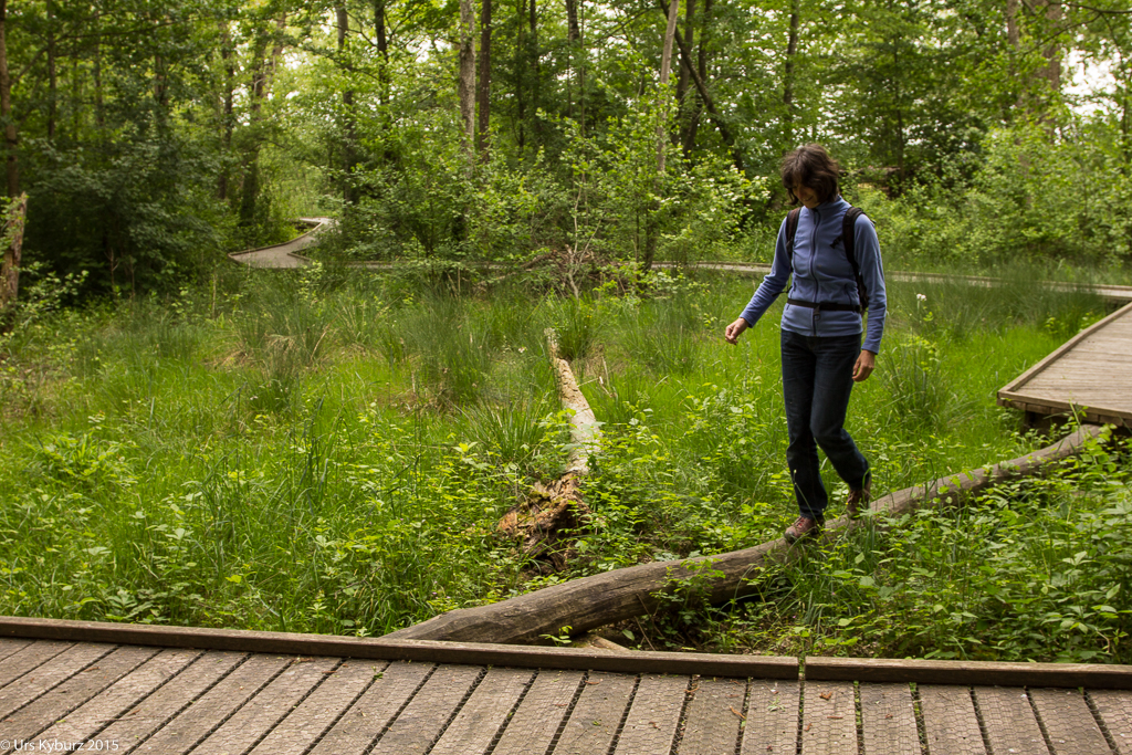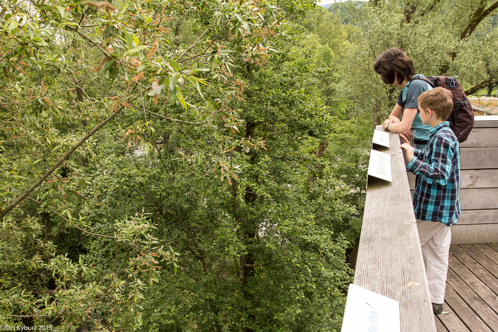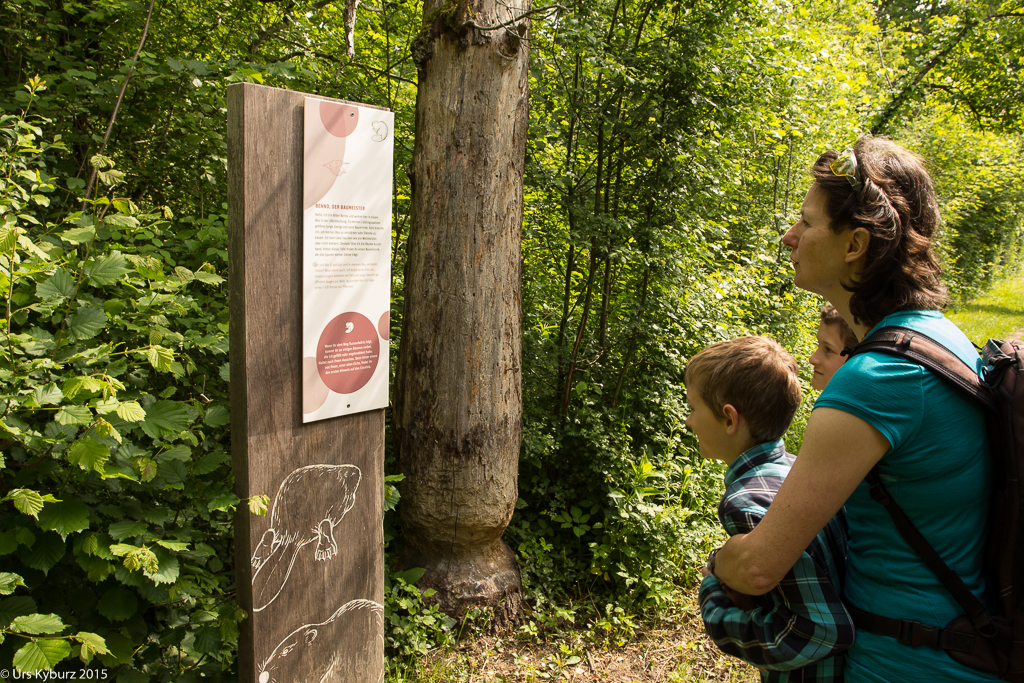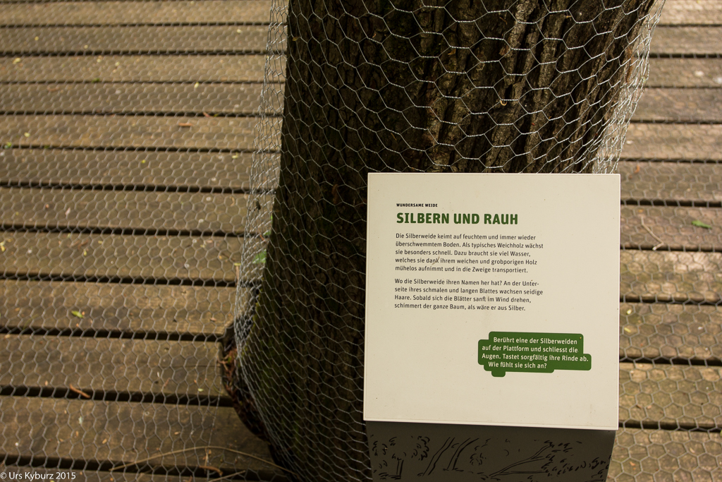 Wir fahren weiter zur Ellikoner Brücke, in deren Nähe wir unsere Bikes abstellen und zu Fuss weiter gehen. Ein Lehrpfad für Kinder führt uns durch die Gegend. Am Anfang wird uns eine Aufgabe gestellt: Dem Eisvogel wurden die Eier aus dem Nest geklaut und wir sollen herausfinden, wer es war. Alle weiteren Tafeln geben Hinweise auf den Täter. Und ganz nebenbei lernen wir viel über den Auenwald, deren Bewohner und die Gegend allgemein. Wie schon erwähnt mäanderte die Thur früher frei und unberechenbar durch die Gegend. Bei einer Tafel, mitten im Wald, steht, dass hier früher die Thur durchfloss. Unglaublich!