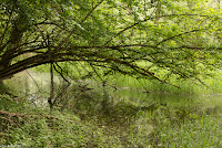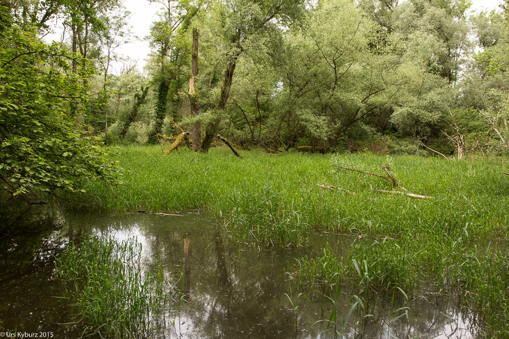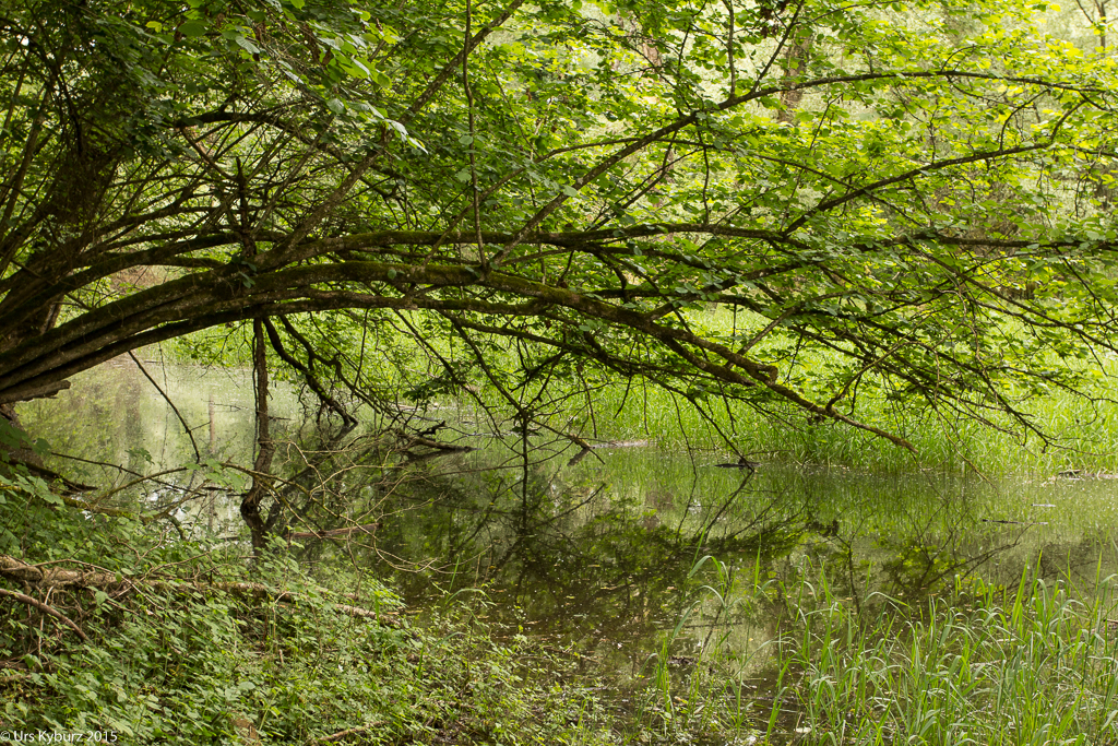 Am Pfingstmontag fahren wir mit den Bikes in die Thurauen, die etwa 1 1/2 Kilometer vom Zeltplatz entfernt sind. Im Wald können wir auch wieder trockenen Fusses auf einem Holzsteg gehen. Die Äste hängen tief, Weiher reiht sich an Weiher. Wunderschön wild! Immer wieder meinen wir den Pirol zu hören, sind uns aber trotzdem nicht sicher.