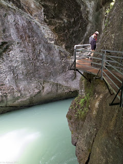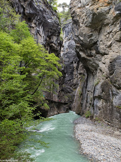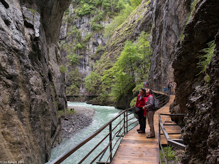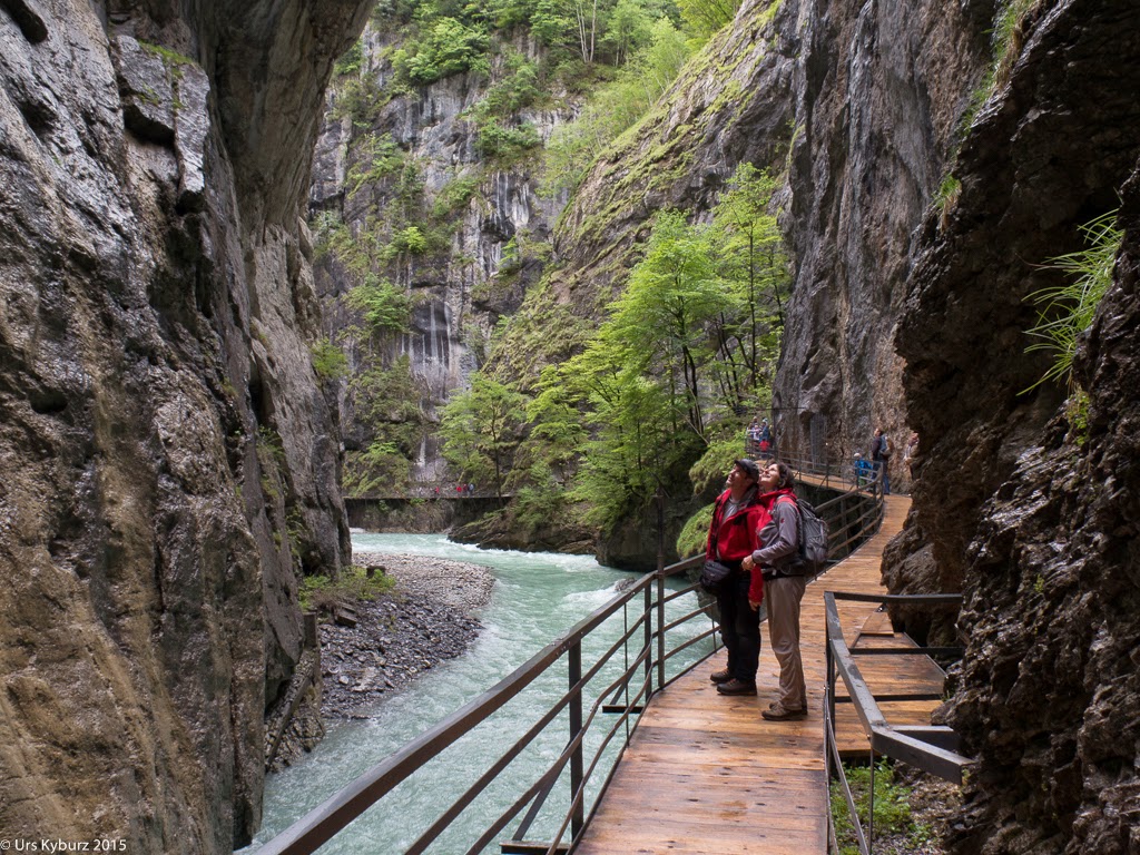 Nach dem Wintereinbruch am Vortag ist der Frühling zurückgekehrt. Langsam schmilzt der Schnee wieder, die Berge der Engelhörner und der Wetterhörner sowie der Eiger leuchten blendend weiss im Sonnenlicht. Wir starten die Besichtigung beim Eingang West der Schlucht. Infotafeln verraten uns die Geheimnisse der Entstehung dieser Schlucht. Die Gegend war zur Eiszeit vom Aaregletscher zugedeckt. Nach dessen Rückzug blieben sieben Schluchten zurück, die bis auf die heute bestehende mit Geschiebe aufgefüllt wurden. So frass sich die Aare durch das Gestein und bildete die heute noch bestehende Schlucht. Sie wurde 1896 mit einem Steg für die immer zahlreicher werdenden Touristen erschlossen. Eine Beleuchtung setzte bei Nacht spezielle Akzente, sie musste aber während des Ersten Weltkrieges an das Militär abgegeben werden. Heute ist eine modernere in Betrieb. Vom Eingang her wird die Schlucht schnell eng, die Felsen ragen hoch auf, tief unter uns rauscht die milchig-trübe Aare durch. Zusammen mit dem von oben einfallenden Licht bildet sich eine zauberhafte Stimmung, wenn nicht gerade eine Hord Jugendlicher lautstark vorbei drängt.