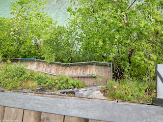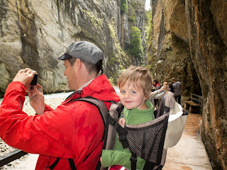 Nachdem wir die ganze Schlucht durchwandert haben, müssen wir wieder zurück. Das geht am einfachsten mit der Meiringen-Innertkirchen-Bahn, einem einzelnen Triebwagen. Um zur Haltestelle zu gelangen, überquert man zuerst eine Hängebrücke und wartet dann vor dem Felsen. Fährt der Zug ein, öffnet sich ein Tor im Felsen und man kann einsteigen. Im Zug wird man von der Lokführerin sehr nett empfangen, sie tippt einem auch gleich das richtige Billette ein. Das ist eine schöne Geste, aber es ginge wohl noch effizienter... An der nächsten Haltestelle steigen wir bereits wieder aus. Auf dem Spielplatz vor dem Eingang West essen wir nun zuerst mal, die Kinder toben aber schnell auf dem Spielplatz herum, während wir Eltern gemütlich diskutieren können.