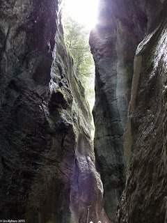 Eine Regenjacke ist nicht die schlechteste Ausrüstung, es tropft überall herunter. Die Schlucht ist mal nur wenige Meter breit, dann wieder einige Dutzend. Dort sind die Wände denn auch bewachsen mit Bäumen und Sträuchern, es sieht wunderbar aus. Silvan, unser Ornithologe, hat seine Augen natürlich wieder auf die Vögel gerichtet und entdeckt im Flussbett mindestens fünf Bergstelzen. An einer Stelle verrät uns eine Tafel, dass während des Zweiten Weltkrieges Kavernen in den Fels gebaut wurden, die Unterkunft boten für 180 Mann Besatzung. Das Innere war geradezu luxuriös, die Wände waren getäfert, es hatte Aborte mit Wasserspülung, so ein Zeitzeuge.