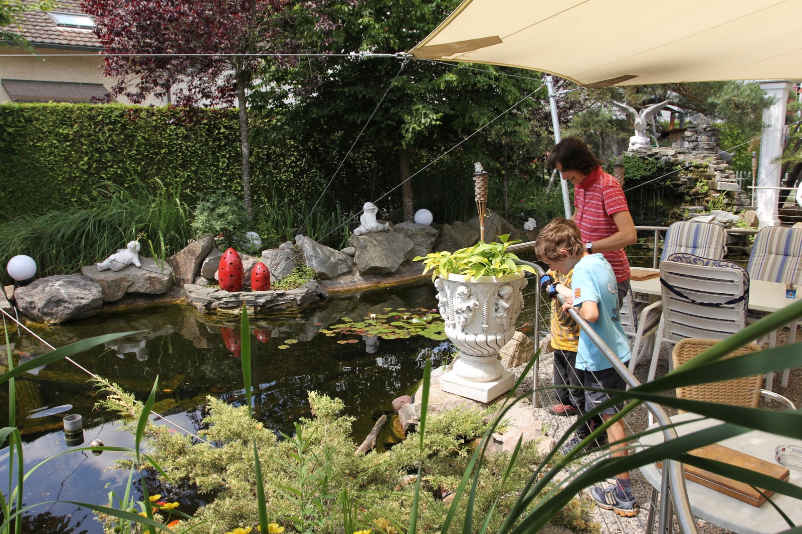 Wir durchfahren das sehr ländliche Boningen, das mit wunderschönen renovierte Bauernhäuser aufwartet. Wir durchqueren einen Wald und eine grosse Kiesgrube, die einen längeren Aufenthalt wert wäre, sieht sie doch ökologisch interessant aus. Da wir aber einen Termin haben, müssen wir weiter. Die Aare sehen wir nicht, wir sind relativ weit entfernt von ihr. An Fulenbach vorbei gelangen wir bei Wolfwil wieder an die Aare. Da wir noch viel Zeit haben bis zu unserem Meeting, kehren wir in der "Fähre"-Gartenwirtschaft ein, einem romantische Beizli. Am Fluss unten kann man auf einer richtigen Fähre selbigen überqueren.